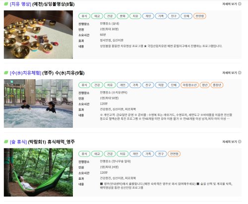 4) 프로그램 예약: 국립산림치유원은 기본적으로 자연 속에서의 힐링과 치유를 목표로 하는 다양한 프로그램을 제공하고 있습니다. 그리고 산림복지 프로그램을 이용하셔야 객실 사용이 가능합니다. 최소 한 개 이상의 프로그램을 반드시 예약해야 합니다.