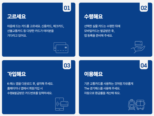 전용 카드 (선불형 또는 후불형) 발급 후, K-패스 홈페이지를 통해 더 경기패스 신청 회원가입을 하면 되는데 가입방법은 아래와 같습니다.