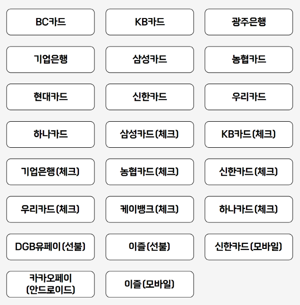 기업은행(체크) | 농협카드(체크) | 신한카드(체크) | 우리카드(체크) |
