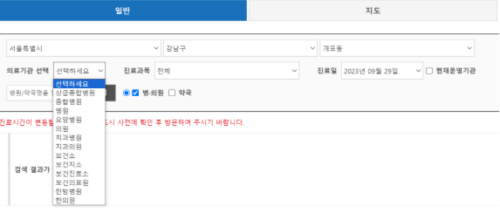 - 일반검색에는 시와 구, 동, 의료기관 종류 등을 선택해서 검색할 수 있습니다.