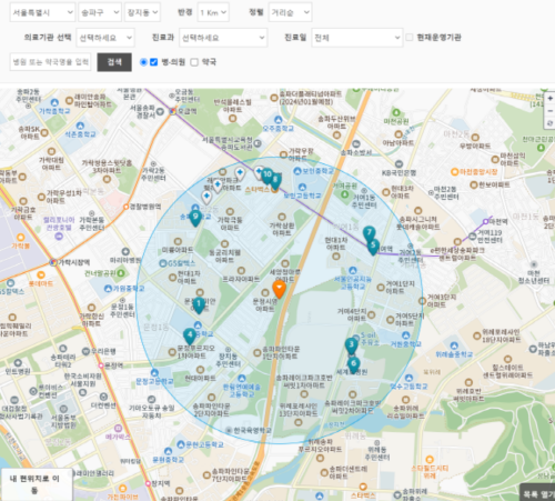 - 선택한 조건에 맞는 병원과 약국이 지도에 표시됩니다.
